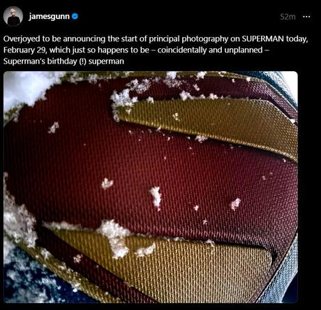 "Jeg er meget glad for at kunne annoncere starten på optagelserne til SUPERMAN i dag, den 29. februar, som tilfældigvis og uplanlagt er Supermans fødselsdag (!) Da jeg var færdig med det første udkast til manuskriptet, kaldte jeg filmen Superman: Legacy. Da jeg skrev det endelige udkast, stod det klart, at titlen skulle være SUPERMAN. På vej til dig i juli 2025. Tillykke med fødselsdagen, Clark!"