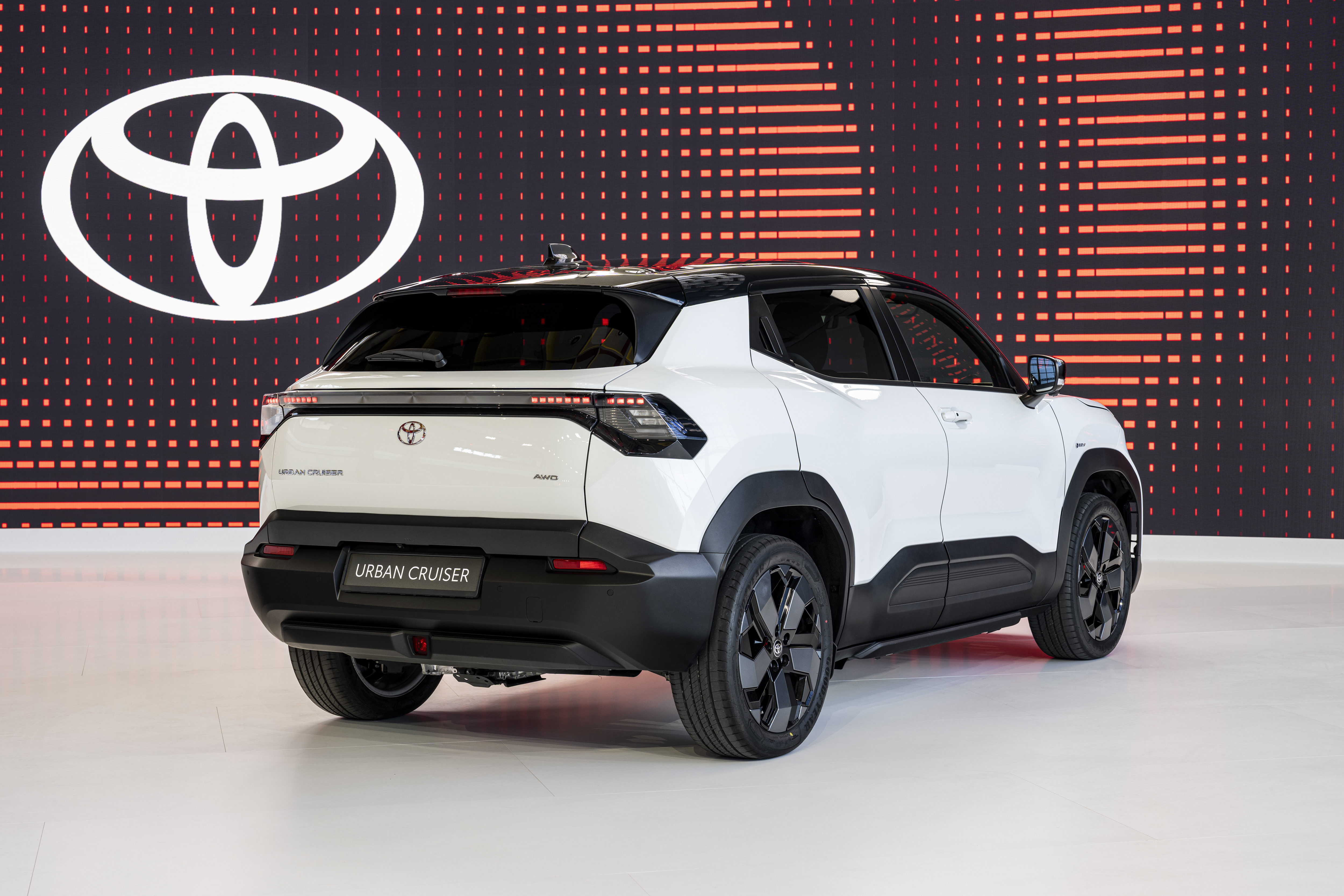 Urban Cruiser har et typisk nyt Toyota-design med en front i hammerhovedstil, smalle forlygter og massive bagskærme med LED-striber. Elbilen er lidt større end Yaris Cross Hybrid, men byder på en rummelig kabine takket være en akselafstand på 2.700 mm.