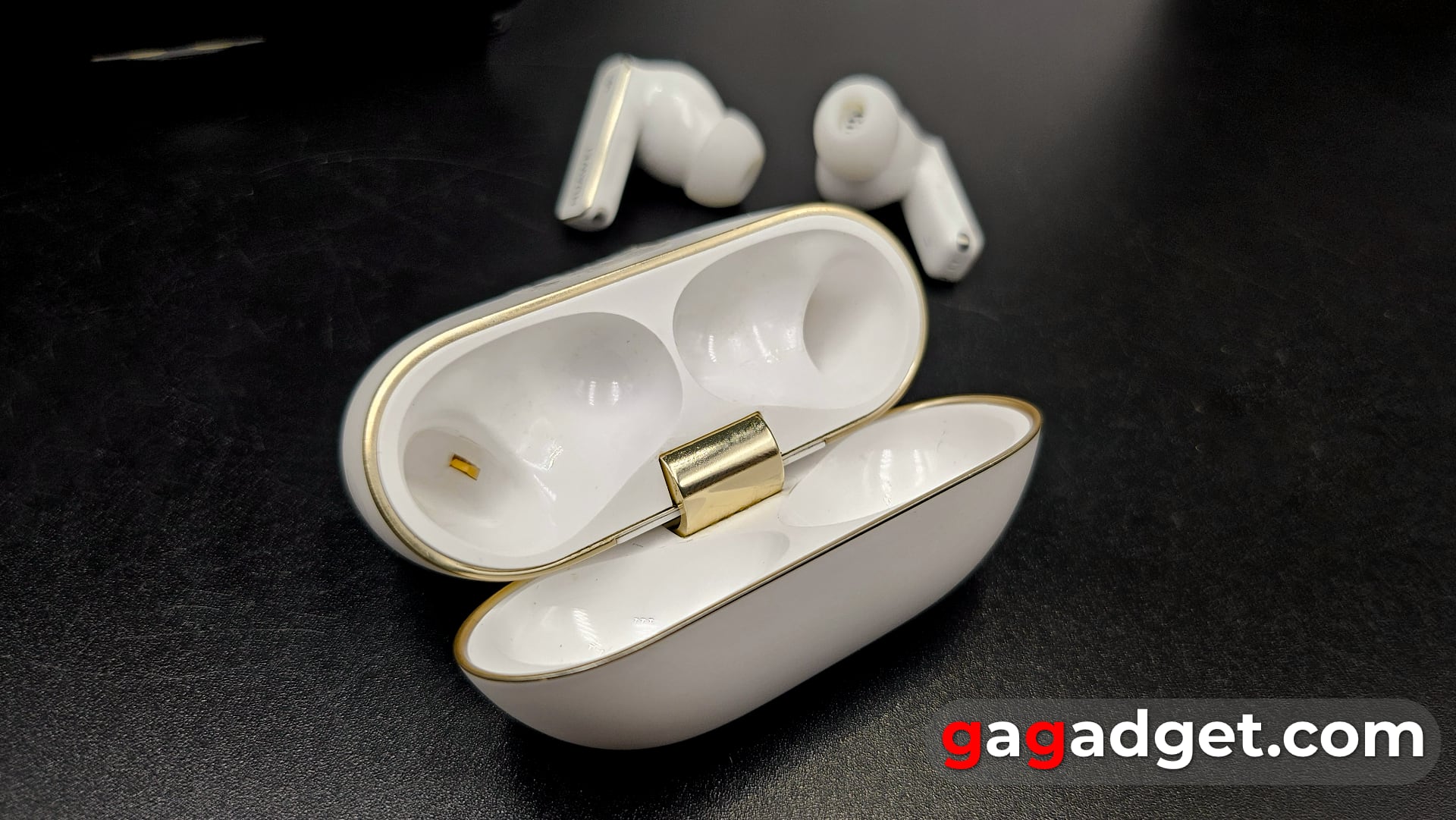 Opladningsetuiet er behageligt at røre ved - mat plastik på ydersiden (bortset fra området med strengene omkring logoet, som er poleret) og lakeret med en antydning af perlemor på indersiden. De gyldne elementer (hængslet og kanten på låget, opladningsstikket og logoet) ser ikke sigøjneragtige ud, men tilføjer et strejf af adel. Huawei kalder materialet omkring logoet for Ceramic DECO og hævder, at det er lavet efter en 72-timers sintringsproces ved 1480 °C. Dette ser ud til at gøre materialet mere holdbart og modstandsdygtigt over for stød, men det ligner mere et markedsføringstrick, fordi det ville være mere logisk at gøre hele kabinettet stærkere, ikke et fragment af det. Interessant nok har etuiet sin egen højttaler, men den bruges kun til at give et signal under opladning.