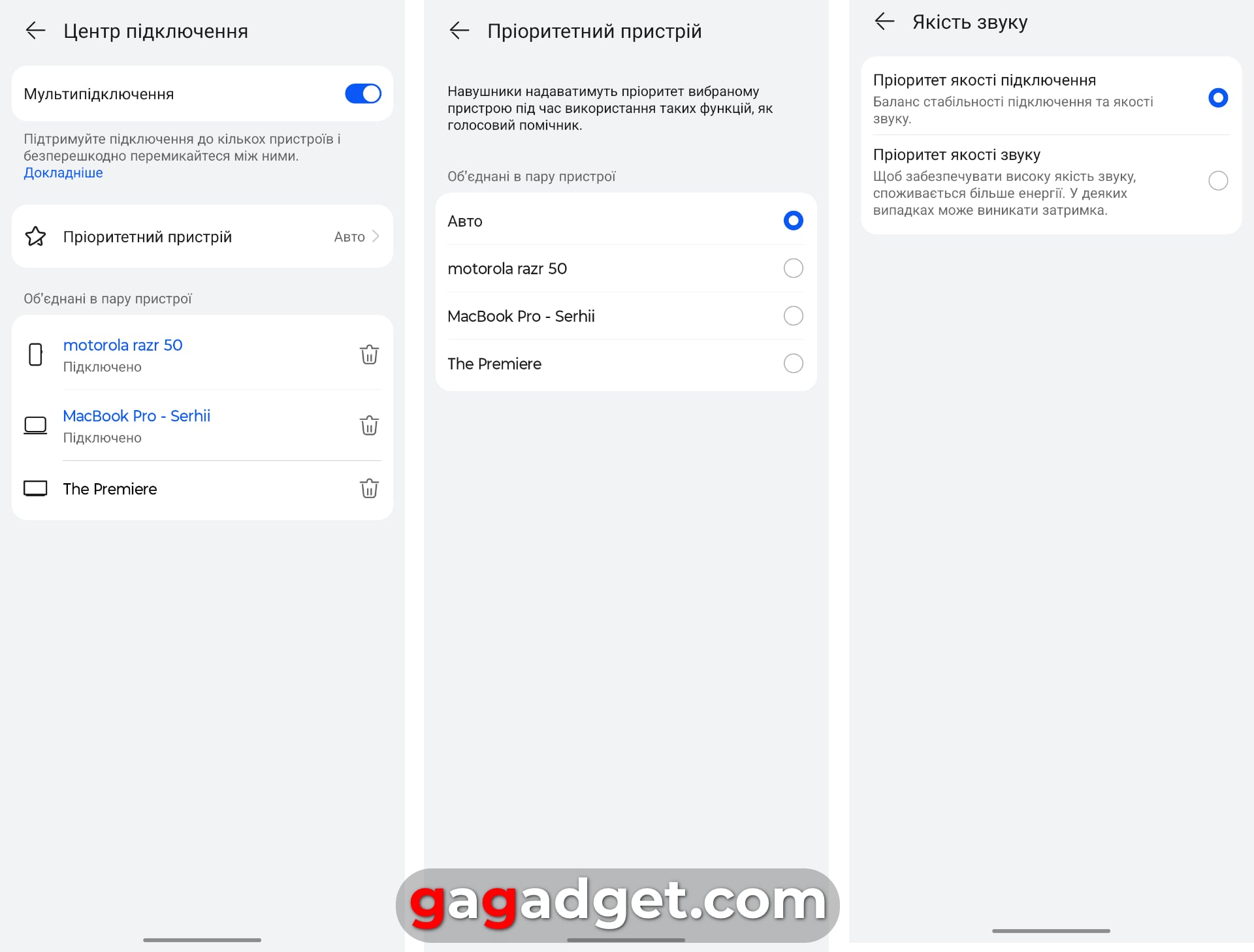 En interessant ting er, at du kan vælge lydprofiler direkte på hovedtelefonernes hovedskærm. De duplikeres af store fliser. 10-bånds equalizeren og den avancerede hovedtelefonkontrol er bemærkelsesværdig: Tryk, hold og stryg for at justere lydstyrken. Der er også mulighed for at besvare/afvise et opkald ved at vippe hovedet. Jeg vænnede mig aldrig til det (sandsynligvis fordi jeg ikke foretager nok taleopkald). Generelt er appen nyttig, og jeg understreger endnu en gang - hvis du køber disse hovedtelefoner, skal du installere og bruge dem. Der er også en assistent til tilpasning af hovedtelefoner. Og en liste over alle de taktile kontrolbevægelser og deres indstillinger (jeg er ikke fan, men nogen kan få brug for det, hvis man vænner sig til alle disse kombinationer med to og tre berøringer). Du kan også indstille prioriteringen af lydkvalitet (for mig) eller lav latenstid (til spil).