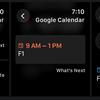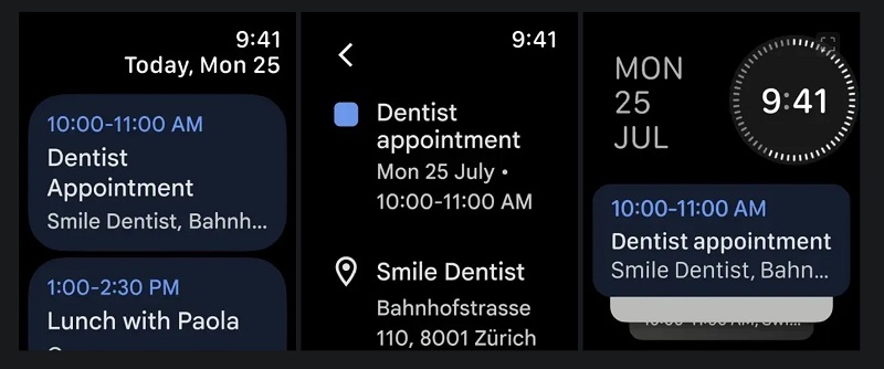 "Kalender" blev den fjerde applikation fra Google til watchOS og tilbyder en brugervenlig grænseflade: begivenheder vises i form af kort med farvekodning, tid, navn og sted for mødet. En ugentlig oversigt og en liste over aktuelle datoer i øverste højre hjørne af skærmen er også tilgængelige.